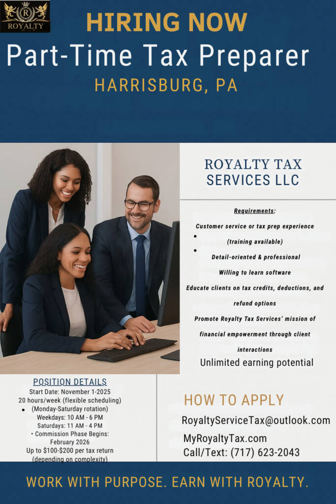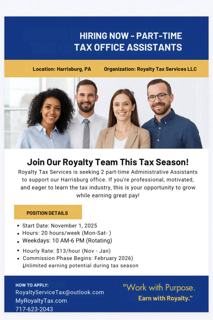 Royalty Tax Services LLC is seeking a motivated and detail-oriented Part-Time Tax Preparer to join our growing team. This position is ideal for someone who enjoys working with people, is eager to learn, and wants to make an impact in their community during tax season.